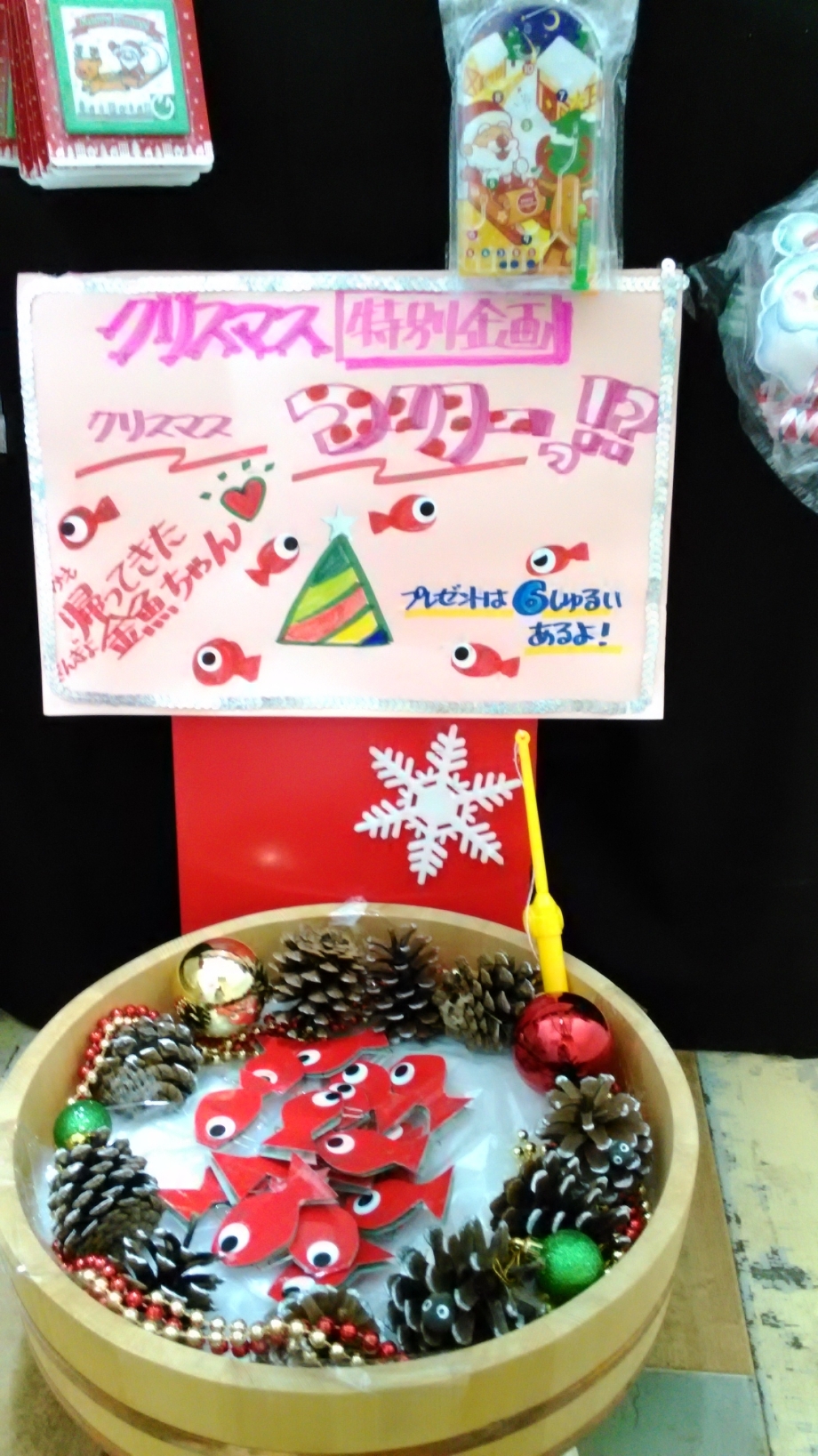 釣って楽しいめくってうれしい金魚くじ。6種類のクリスマスおもちゃの中から何が当たるかな![]()