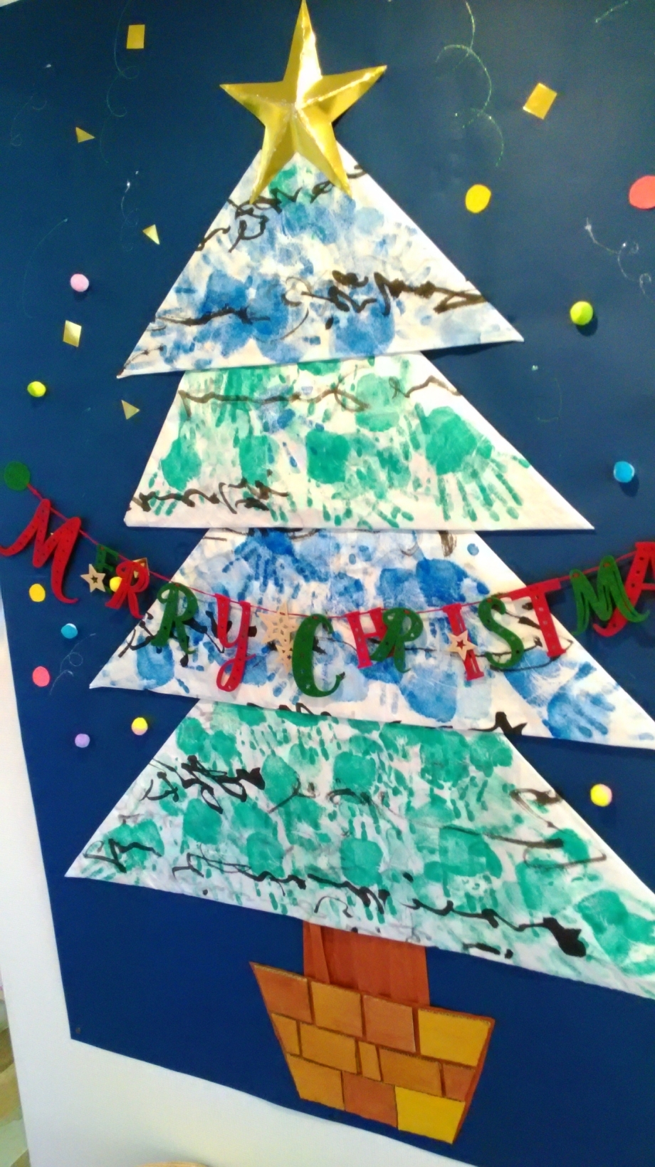 こちらはキッズクラブのお友達の手形を集めて作ったクリスマスツリー