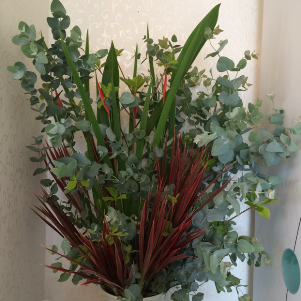 暑い時期は、グリーンを主体にしたアレンジメントをお願いしています。 彩りに添えられた朱が、程よいアクセントになっていますね。