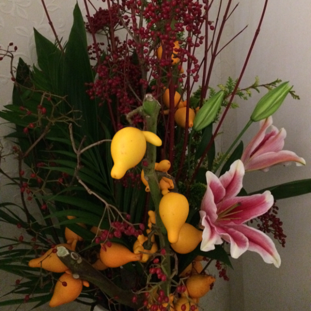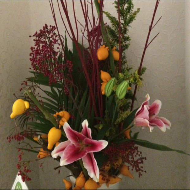 【今週の花材】 フォックスフェイス 珊瑚水木 ガマズミ 百合 ハラン