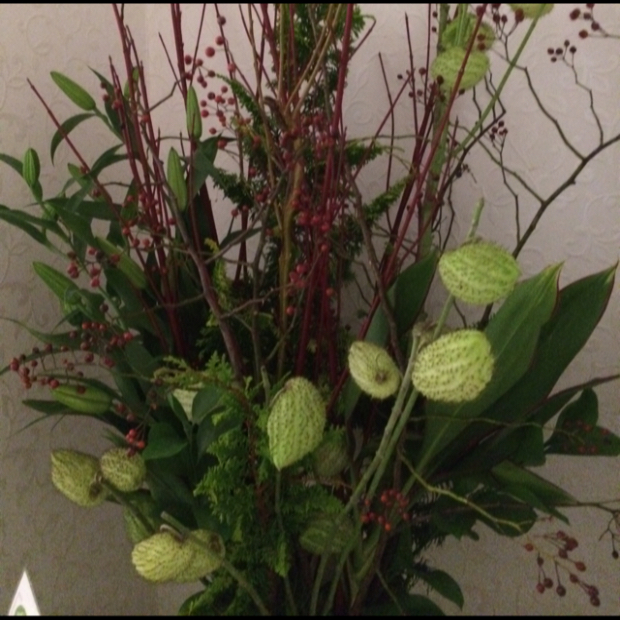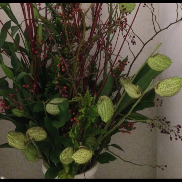 【今週の花材】 珊瑚水木 百合 ヒバ 野バラ ドラセナ ルスカス 風船唐綿