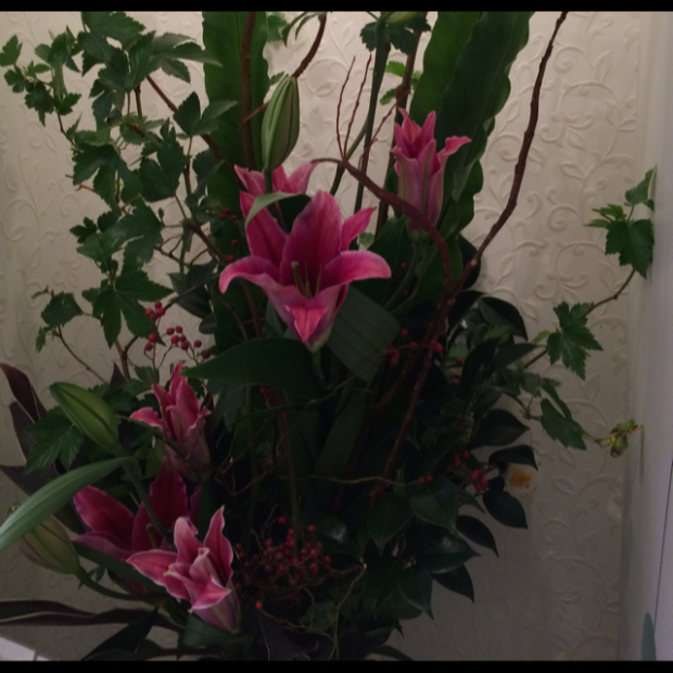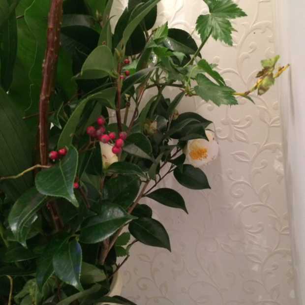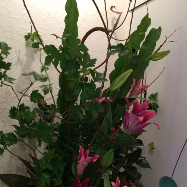 【今週の花材】 木苺 石化柳 百合 野薔薇 椿 ドラセナ